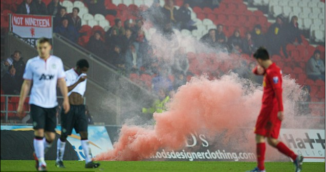 Факли, димки, нахлувания на терена, грозни скандирания - познахте, става дума за дербито на Англия между Манчестър Юнайтед и Ливърпул. И отново сцена на хулиганските прояви стана сблъсъкът между двата вечни съперника при младежите. Заради по-слабата охрана на "Лангтрий парк" крайните привърженици на "червените дяволи" отново напомниха за себе си, като на два пъти спираха играта между отборите до 21 години на Манчестър Юнайтед и Ливърпул, хвърляйки факли на терена. Един от тях нахлу на терена и се втурна към нападателя на мърсисайдци Адам Морган, а на няколко пъти гъст червен дим се стелеше около полето заради запалени димки.