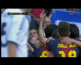 В 17-ата Меси не стигна добро негово подаване, но минута по-късно взаимодействието се оказа голове. Бразилецът прекрасно видя включването на Бълхата, Лео финтира Рамос и насочи в близкия ъгъл по земя - 1:1. Диего Лопес не можа да стигне топката, която беше изстреляна от десетина метра. "Десетката" вкара 39-ия си гол в Примера и продължи серията си от 16 поредни шампионатни кръга с попадение и изравни Алфредо ди Стефано с 18 гола в Ел Класико. При радостта след гола Жорди Алба сякаш направи грозен жест с лявата ръка към феновете на "лос меренгес", но впоследствие каза, че е вдигнал показалеца, а не средния си пръст.