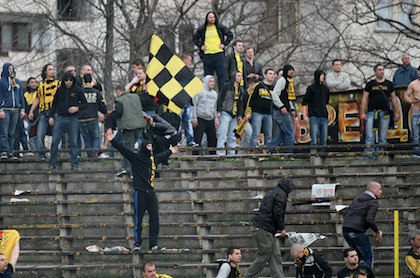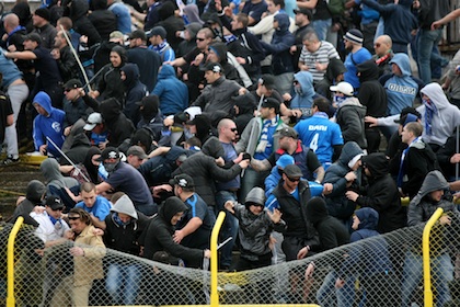 Невероятната атмосфера, хубавите хореографии на агитките и тези над 19 000 зрители по трибуните бяха помрачени в средата на първата част, когато стана страхотно меле. “Сините” фенове скъсаха знаме на бултрасите, които побесняха и над 300 от тях се засилиха към сектора на гостите, разделен от буферна зона. От там започна едно замерване с камъни, железа и бомби. Гостуващите ултраси отвърнаха с няколко сигнални ракети. Бой с полицията, счупени огради, глави и няколко арестувани бяха резултата от грозните сцени.
