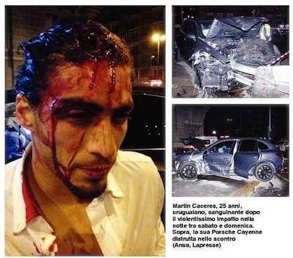 Защитникът на Ювентус Мартин Касерес в момента се възстановява след автомобилната катастрофа, която претърпя в неделя сутринта в Торино и появилите се в Интернет снимки показват ясно, че инцидентът е бил достатъчно сериозен. Предната част на Поршето на 25-годишния уругваец е направо размазана, а на една от снимките се вижда окървавената глава на поливалентния футболист.