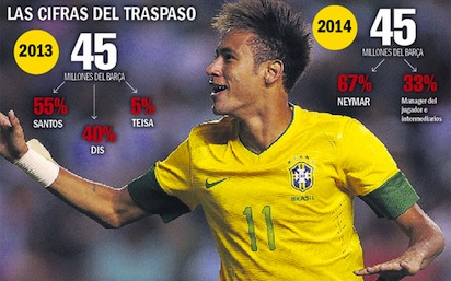 Общо Барселона ще плати 45 млн. евро за Неймар. От тях обаче само 30 млн. ще влязат в касата на Сантос, защото клубът притежава 55% от правата на нападателя. Останалите са разпределени между инвестиционните компании DIS и TEISA, които държат съответно 40% и 5%.