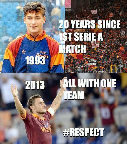 Капитанът на Рома Франческо Тоти празнува днес 20-годишен юбилей в италианския футболен елит. Тоти дебютира за столичани в калчото още на 16-годишна възраст на 28 март 1993 година. "Принца на Рим" остана верен на родния си клуб и за две десетилетия с фланелката на "вълците" реализира общо 295 гола, 226 от които в Серия "А", с което заема второто място във вечната ранглиста на най-добрите реализатори в италианското футболно първенство. Тоти помогна на Рома да стане шампион през 2001 година, а с националния отбор на Италия спечели световната титла през 2006 година.