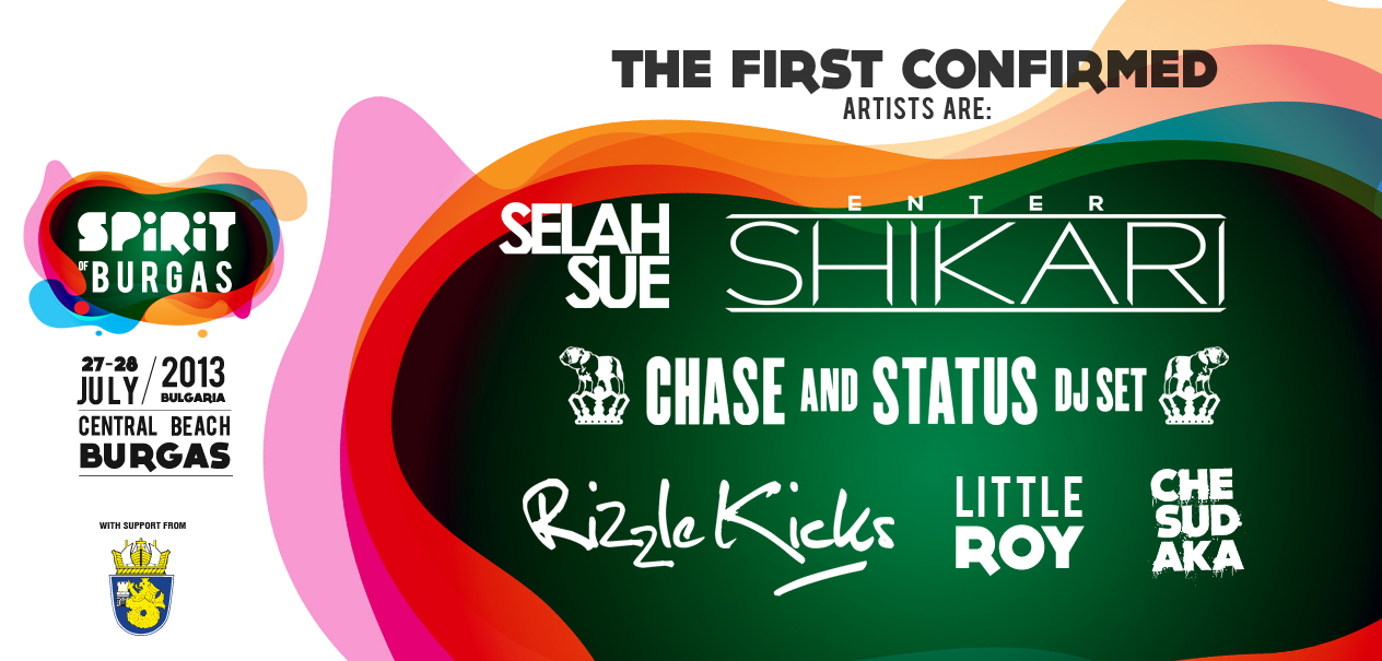 Тазгодишното издание на най-мащабното музикално събитие на годината, SPIRIT of Burgas, ще посрещне за шести пореден път едни от най-нашумелите и горещи имена от световната музикална сцена. Пъстрата програма ще представи разностилни артисти от почти всички музикални жанрове – реге, хип-хоп, дръм енд бейс, пънк, соул, хардкор, дъб-степ и мн. др. Сред първите имена, които разкриха организаторите, са горещото поп-рап дуо RIZZLE KICKS, бисера SELAH SUE, CHASE & STATUS DJ Live, реге легендата LITTLE ROY, фестивалните зверове CHE SUDAKA и експлозивните ENTER SHIKAR. Лимитиран брой промоционални билети за SPIRIT of Burgas 2013 са вече в продажба в мрежата на Евентим на цена от 99 лв.