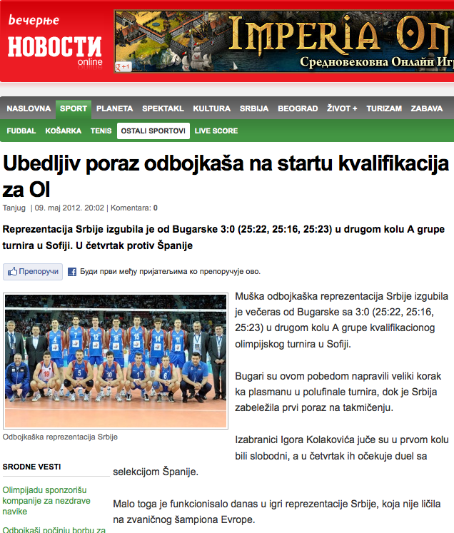 "Човек, който е гледал мача България - Сърбия и не е знаел предварително, че ние сме шампиони на Европа, едва ли ли би го допуснал на фона на показаната от селекцията на Игор Колакович игра", коментира тъжно белградският всекидневник "Вечерни новости" след загубата от България с 0:3 на олимпийската квалификация в София.