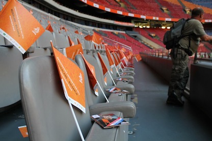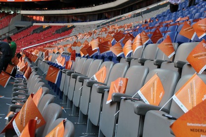 Утре вече се очаква над 50 000 фенове на Холандия да присъстват на „Амстердам Арена” в контролата с България. Двубоят ще е първи на собствен терен за "лалетата" в подготвителния период за Евро 2012, като се очаква с голям интерес от феновете в Ниската земя. Няколко доброволци наредиха хореография по всички седалки на стадиона-красавец, като съвсем нормално бе подминат сектора за гости. При излизането на двата отбора преди началния съдийски сигнал всички фенове ще развеят по едно холандско знаме, за да може „Амстердам арена” да заприлича на „оранжево” море.