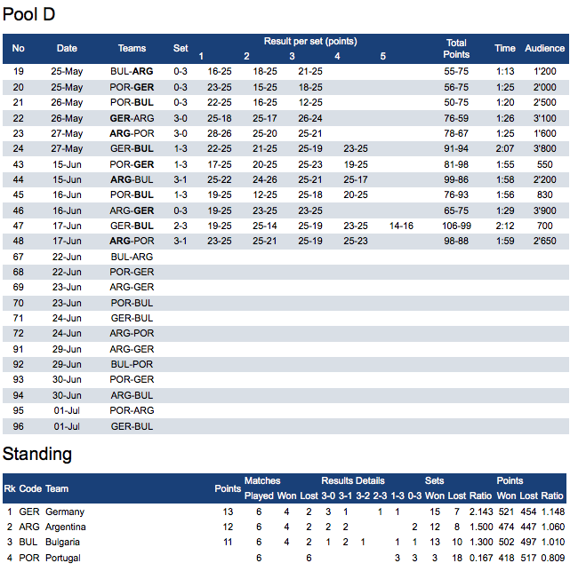 Националисте ни имат в актива си общо 4 победи и 2 загуби и 11 точки. Лидер е Германия с 13 точки, а Аржентина е втора с 12 точки.