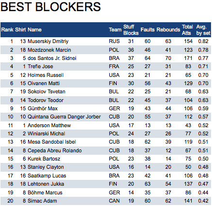 Цветан Соколов е №7 при блокировачите с 22 успешни блокади (0,63 точки средно на гейм). Със същите показатели №8 е Теодор Тодоров. Лидер е руснакът Дмитрий Мусерски с 32 блока.