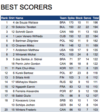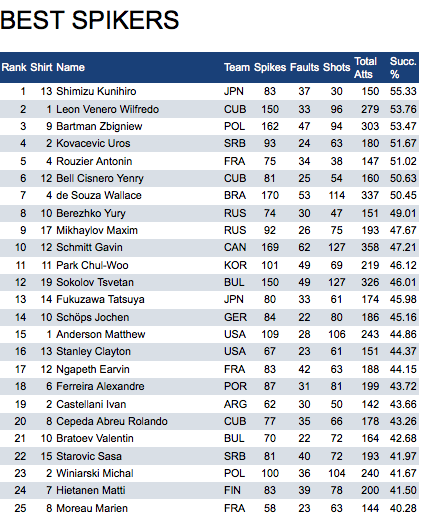 Цветан Соколов е №12-ти при нападателите с 46,01% ефективност в атака. Лидер е японецът Кунихиро Шимицу с 55.33% ефективност.