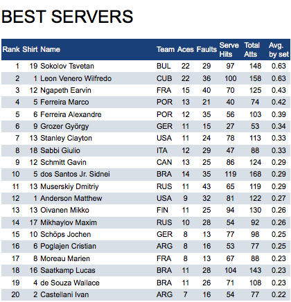 Соколов е забил 22 аса в двубоите до сега, като е постигнал 0,63 точки средно на гейм. Същите показатели има и капитанът на Куба Вилфредо Леон 22 аса и 0,63 точки средно на гейм, но той е изпълнил 100 сервиса, а Соколов 97. Трети е французинът Ървин Нгапет с 15 аса.