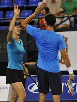 Най-добрите ни тенисисти Цветана Пиронкова и Григор Димитров постигнаха изключително престижна победа на турнира за смесени отбори "Хопман Къп" в Пърт, Австралия. Българският тандем навакса изоставане от един сет и в крайна сметка победи датската двойка Каролин Вожняцки и Фредерик Нилсен с 3:6, 6:4, 10:1. Така Цвети и Григор надделяха над Дания с общ резултат от 2:1 победи, след като по-рано днес пловдивчанката загуби на сингъл срещу световната номер 1, а 76-ият в света Димитров се справи с Нилсен в два сета. Цвети и Григор записват първата крайна победа за България в турнира.