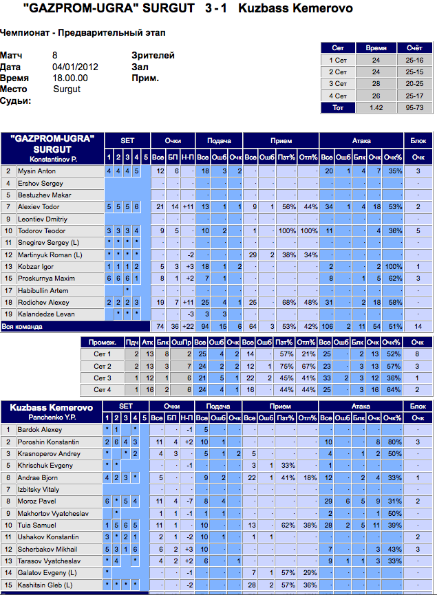 КУЗБАС: Михаил Щербаков 6, Павел Мороз 11, Бьорн Андрае 5, Самюел Туя 11, Константин Ушаков 2, Константин Порошин 11 - Евгений Галатов-либеро (Хлеб Кашицин-либеро, Вячеслав Махортов 1, Евгений Хрищук, Андрей Красноперов 4, Алексей Бардок, Вячеслав Тарасов 4)