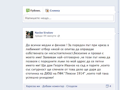 До всички медии и фенове ! За пореден път при криза в любимият отбор някой се опитва да оправдае собствената си несъстоятелност,безсилие и провал с моето име! Заявявам най-отговорно ,че този път няма да позволя с поредните лъжи по мой адрес да се петни името ми! Ще дам Георги Иванов на съд и парите ,които със сигурност ще спечеля от това дело ще даря до стотинка на ДЮШ на ПФК "Левски 1914" ,която той така успешно унищожи!