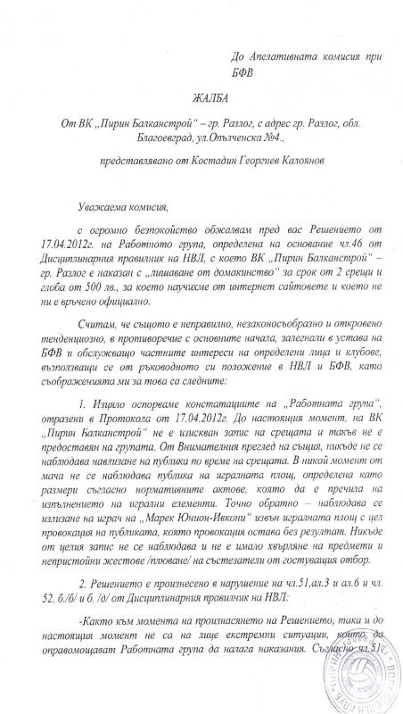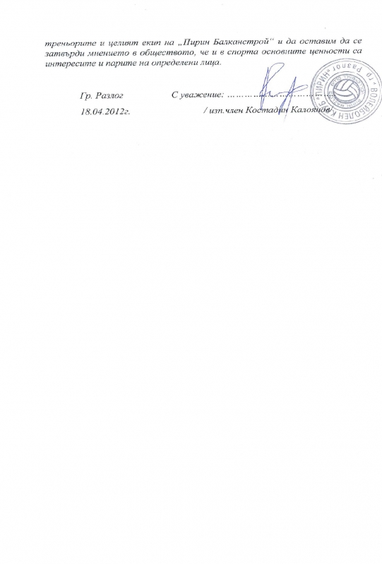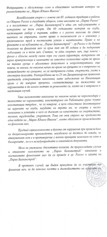 Калоянов дори още по-далеч в изявлението си, като обяви, че ще бъде закрит клуба и единствената причина ще е решението за отнемане на домакинството. "Волейболът е опорочен. Наказанието ще е причина да закрием клуба. За какво да наливаме пари в школата. Няма смисъл. От 60 години публиката в Разлог очаква този финал, а сега се лишени от това", допълни Калоянов.