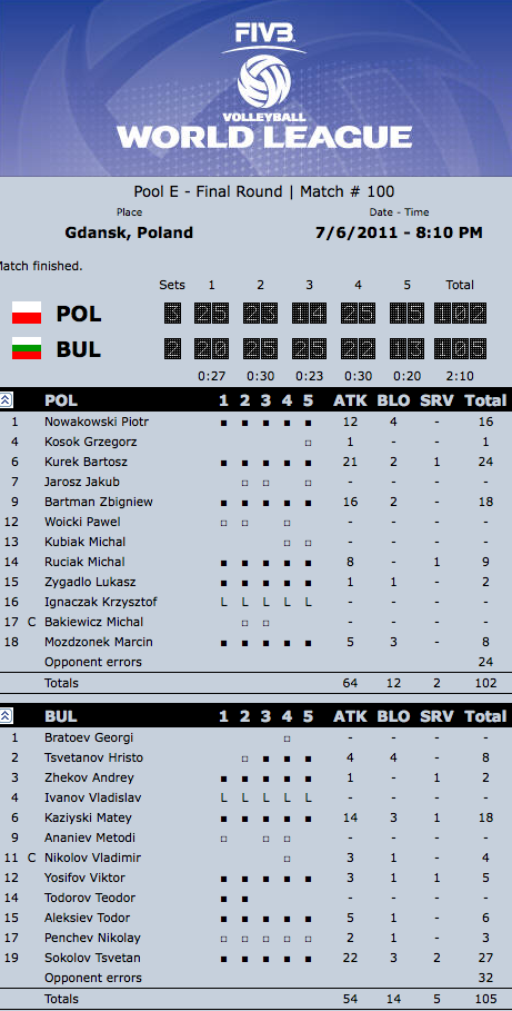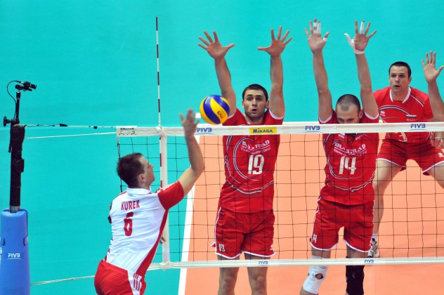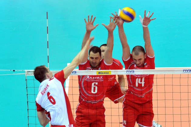ПОЛША: Лукаш Зигадло 2, Збигнев Бартман 18, Пьотър Новаковски 16, Марчин Мозджонек 7, Михал Ручиак 8, Бартош Курек 23 - Кжиштоф Игначак-либеро (Павел Воицки, Якуб Ярош, Михал Бакиевич, Михал Кубиак)