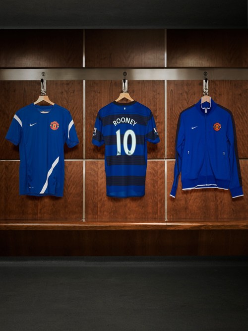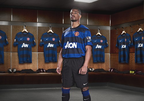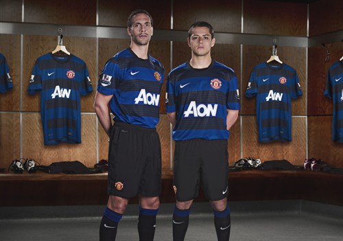 Манчестър Юнайтед официално представи резервните си екипи за новия сезон. Фланелката ще бъде синьо-черна, като ивицити са хоризонтални. Гащетата и чорапите са изцяло черни. Рио Фърдинанд, Хавиер Ернандес, Уейн Рууни и Патри Евра позираха за представянето.