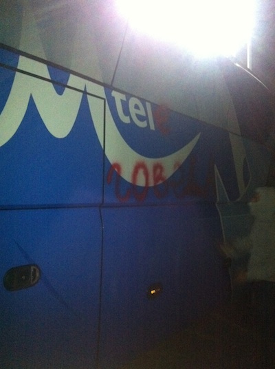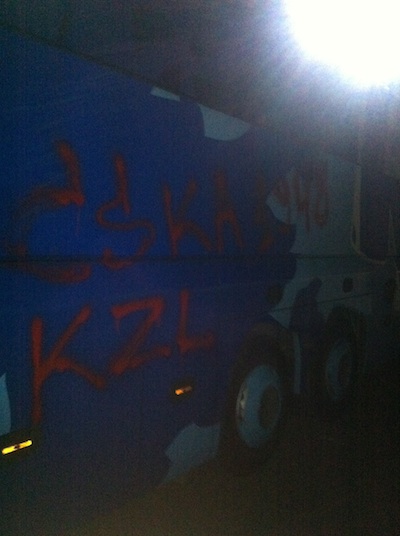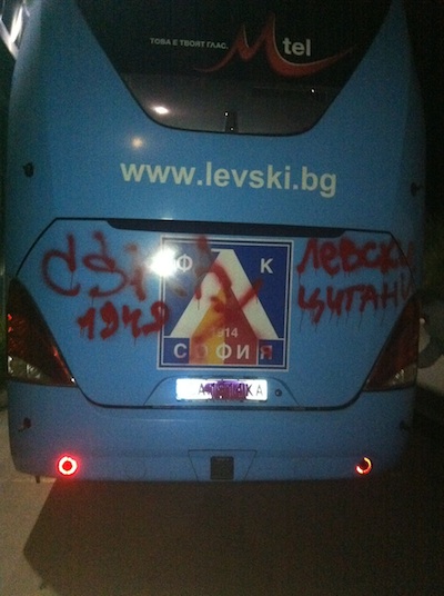 на стадион "Българска армия", вандалските прояви на феновете продължават с пълна сила. Този път потърпевш бе автобусът на другия столичен гранд Левски. Возилото осъмна с надписи "CSKA 1948 KZL", "Левски цигани" и "говеда". За щастие най-модерният автобус в "А" група не е бил изпочупен. Инцидентът се е случил в Поморие, където "сините" бяха отседнали преди днешното си гостуване на Черноморец в Бургас. Двубоят е от 18:00 часа на стадион "Лазур".