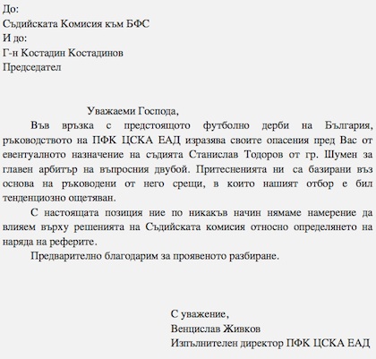 Ръководството на ЦСКА се обърна към БФС с молба относно съдията на предстоящото дерби с Левски. "Червените" не искат за рефер да бъде назначен Станислав Тодоров. Международният арбитър от Шумен е в "черната" графа на клуба от "Българска армия", тъй като при негово съдийство ЦСКА бил ощетяван сериозно.  В писмото до БФС, подписано от изпълнителния директор Венцислав Живков, се уточнява, че "червените" по никакъв начин нямат намерение да влияят върху определянето на наряда.