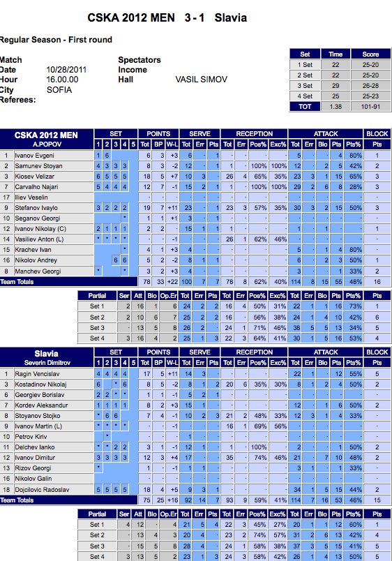 СЛАВИЯ: Венцислав Рагин 17, Николай Костадинов 8 (2 аса, 2 блока, 50% ефективност в атака, 30% перфектно и 35% позитивно посрещане), Борислав Георгиев 1 (1 ас), Александър Кордев 8 (2 блока, 50% ефективност в атака), Димитър Иванов 12, Радослав Дойчилович 18 - Мартин Иванов-либеро (56% перфектно и 69% позитивно посрещане) (Стойко Стоянов 7 (3 аса), Янко Делчев 3 (2 блока), Георги Ризов 1, Кирил Петров)