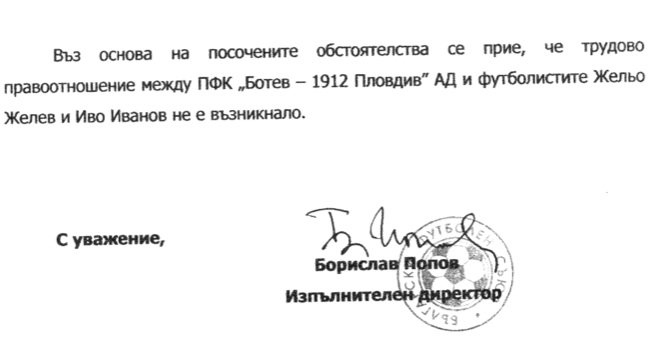 Решението от април 2008 година по случая с Иво Иванов помага да се докаже, че дори договорът между Карвальо и Левски да е валидно сключен, той не е породил действие.