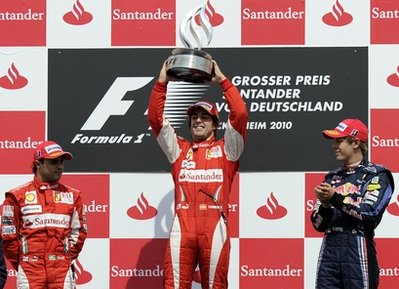 Пилотът на Ферари Фернандо Алонсо спечели по много спорен начин Гран при на Германия във Формула 1, след като малко преди края беше пропуснат нарочно напред от съотборника си Фелипе Маса. Алонсо очевидно бе по-бърз от бразилеца, но не успяваше да го изпревари и от бокса на Ферари наредиха на Маса да намали газта. Заповедите в шампионата са забранени и сега се очаква реакцията на ФИА. Трети днес на пистата "Хокенхайм" остана Себастиян Фетел (Ред Бул), пред 4.Люис Хамилтън (Макларън), 5.Дженсън Бътън (Макларън), 6.Марк Уебър (Ред Бул) и др.
