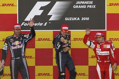 Себастиан Фетел с Ред Бул спечели днешното Гран при на Япония. Германецът стартира от първа позиция и не позволи никакви изненади до края на надпреварата на "Сузука". Втори остана неговият съотборник и лидер във временното класиране при пилотите Марк Уебър. Двамата пилоти на Ред Бул бяха изключително бързи и никой от останалите им конкуренти не успя дори да се доближи до тях, нито пък да ги притесни. Те доминираха и в квалификацията по-рано днес. Тази победа на Фетел е от голямо значение за запазването на шансовете за титлата на младия германец, който печели за първи път от Гран при на Европа насам. Трети в Япония се нареди Фернандо Алонсо с Ферари, който също направи добро състезание. Четвърти остана Дженсън Бътън с Макларън, а пети финишира Люис Хамилтън, който само може да съжалява за този си резултат.