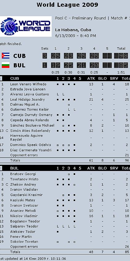 БЪЛГАРИЯ: Андрей Жеков 2, Владимир Николов 18 (1 ас, 1 блок), Матей Казийски 17 (3 аса, 1 блок), Христо Цветанов 2, Светозар Иванов 1, Тодор Алексиев 3 (2 блока) - Теодор Салпаров – либеро (Цветан Соколов, Методи Ананиев 10, Красимир Гайдарски 3 (2 блока), Теодор Богданов 1, Георги Братоев)