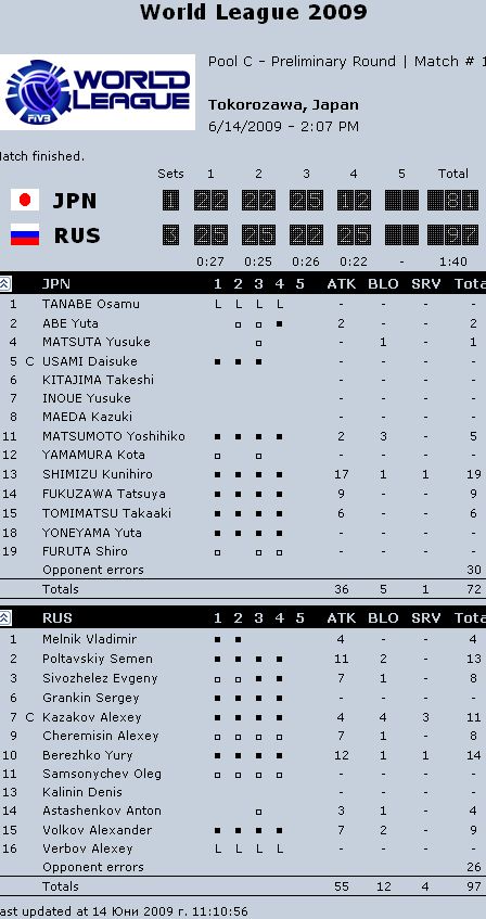 ЯПОНИЯ – РУСИЯ 1:3 (22:25, 22:25, 25:22, 12:25)