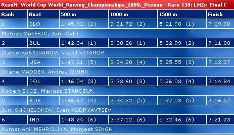 Българският екипаж се класира на 2-ро място във Финал ”Ц” с време 7:11.08 мин. Победители в него станаха словенците Матевц Малашич и Юре Цвет с време 7:09.80. Трета е лодката на САЩ с време 7:12.73.
