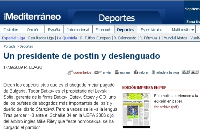 "Специалистите казват, че е най-добре платеният адвокат в България. Тодор Батков е собственик на Левски и съсобственик на фирмата "Батков, Ботев и Стоев и СИЕ". Също така притежава вестник "Стандарт". Това обаче не му пречи да бъде доста дързък и остър в публичните си изкавания. След загубата от Шалке 04 в УЕФА през 2006 година Батков каза: "Този хомосексуалист развали мача", говорейки за съдията Майк Райли", гласи кратката статия на вестник "Медитеранео".