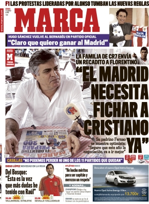 Футболист номер едно за 2008 година Кристиано Роналдо се е устремил с всичка сила към испанския колос Реал Мадрид. Така смятат близки приятели и роднини на 24-годишното крило. Корицата на вестник "Марка" днес разкрива очакванията на неговите сродници. Според мадридския спортен всекидневник семейството на звездата е убедено, че евентуалният бъдещ президент на Кралския клуб Флорентино Перес ще успея да закупи правата върху перлата на Манчестър Юнайтед.