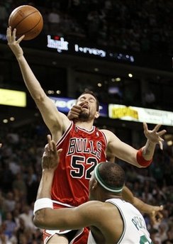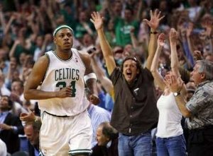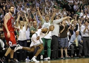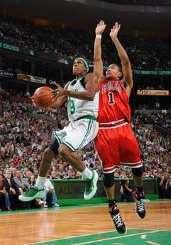 Шампионът Бостън Селтикс успя да изтръгне победа след продължение като домакин на Чикаго Булс в петия мач между двата тима от първия кръг на плейофите в НБА. "Келтите" спечелиха със 106:104 (23:21, 21:26, 22:23, 27:23, 13:11) и поведоха с 3:2 победи в серията. "Биковете" пропиляха аванс от 11 точки в последната четвърт, а в продължението поведоха със 101:100, но не успяха да удържат победата, която щеше да постави под голямо напрежение шампионите. Последните могат да дишат спокойно благодарение на дългогодишния си лидер Пол Пиърс, който излезе на сцената, точно когато "Келтите" имаха нужда от неговото шампионско хладнокръвие. Пиърс донесе успеха на тима си с решаващ кош 3.4 секунди преди края на продължението.