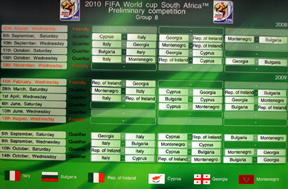 Българският национален отбор ще играе със световния шампион Италия на 11-и октомври във втората си квалификационна среща за Мондиал 2010. Това стана ясно след днешните преговори в гранд хотел "София". "Лъвовете" започват компанията на 6-и септември като гости на дебютанта Черна гора.