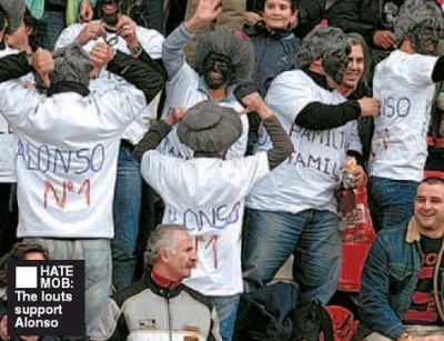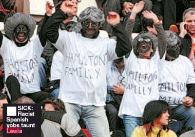 Британският таблоид “The Sun” публикува снимки на испански фенове, които са с боядисани черни лица и коси и се подиграват на Люис със надписи “Семейството на Хамилтън”. От другата страна на фланелките им пише “Алонсо е номер 1”.