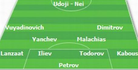 Вратар - Петров, десен бек - Кабус, централни защитници - Тодоров и Илиев, ляв бек - Ланзаат, дефанзивни халфове - Янчев и Маркиньос, десен халф - Велизар Димитров, ляв халф - Вуядинович, нападатели - Неи и Удоджи