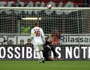 Рома победи с 1:0 Милан на "Сан Сиро" в дербито от 9-ия кръг на Серия „А", като окончателно отказа "росонерите" от титлата. Единственото попадение бе дело на Мирко Вучинич в 70-ата минута, когато разстреля с глава Нелсон Дида след центриране на Сисиньо. Така "червено-черните" останаха с актив едва от 10 точки и без победа в първите си пет домакинства в калчото от началото на сезона. Десет минути по-късно Даниеле Де Росе дори си позволи лукса да изпусне дузпа, след като технично прехвърли и вратата. Нарушението бе извършено срещу него от Масимо Амбрози, който получи втори жълт картон за фаула и остави тима си 10 човека.