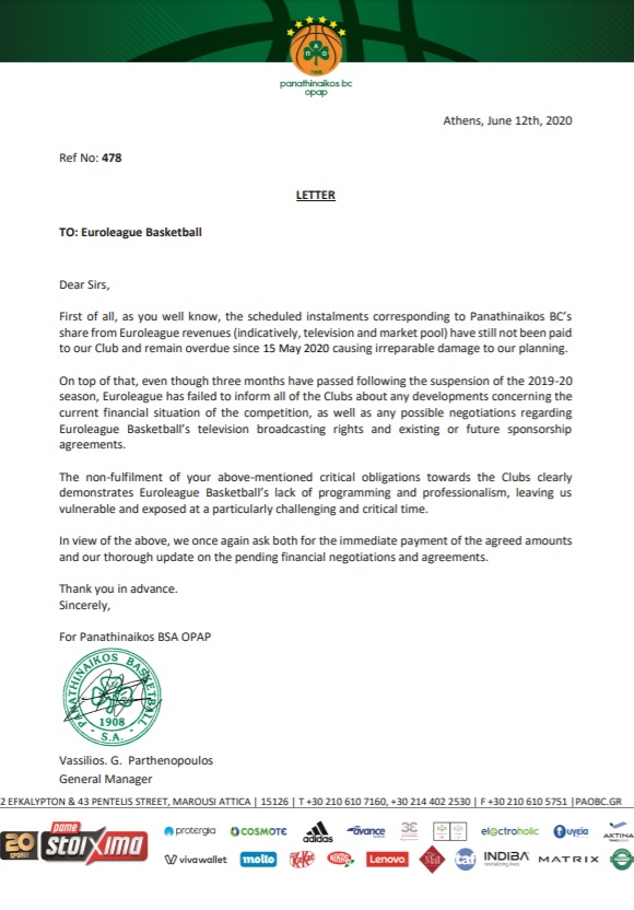 Ден след като пожелаха моментален отговор от Евролигата за оформяне на детайлите по напускането на турнира, днес от Панатинайкос са изпратили още едно писмо до ръководството на турнира на богатите. В него се съобщава, че най-силният клубен европейски турнир все още не е изплатил всичко дължимо към клуба от миналия месец, което "причинява непоправими щети по бъдещите планове на отбора".