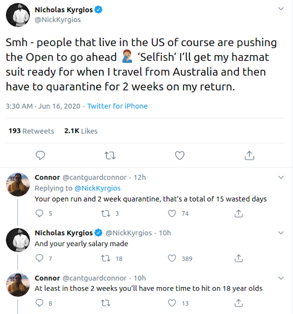 "Разбира се, хората, които живеят в САЩ, натискат за провеждането на US Open. "Егоистично", ще си подготвя защитния костюм, когато дойде време да пътувам от Австралия до САЩ, а на връщане ме чака 2 седмици карантина", написа Кирьос, а в коментар отдолу фен, носещ името Конър, се присмя на австралиеца с репликата: "Походът ти на US Open и двуседмичната карантина - това прави общо 15 загубени дни". Естествено, Кирьос не му остана длъжен и му отговори по следния начин: "И годишната ти заплата".