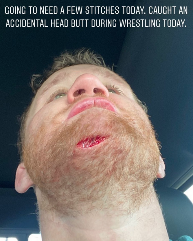 Гейджи, който се очаква да се бие с Нурмагомедов през септември, показа в социалните си мрежи неприятно сцепване на брадата от неволен удар с глава, като сподели, че ще му трябват и няколко шева.