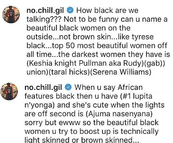 Бившата звезда от НБА Гилбърт Аринас, известен с различни скандални прояви през годините, се извини на кенийско-мексиканската актриса Лупита Нионг'о, която спечели "Оскар" през 2014 година за поддържаща роля за участието си във филма 12 Years a Slave. През 2017 година бившият пойнт гард на Уошингтън Уизардс изрази мнение в Instagram, оспорващо красотата на тъмнокожите жени. Тогава известният с прякора Agent Zero баскетболист написа по адрес на Нионг'о, че тя е "сладка, когато светлините са изключени".