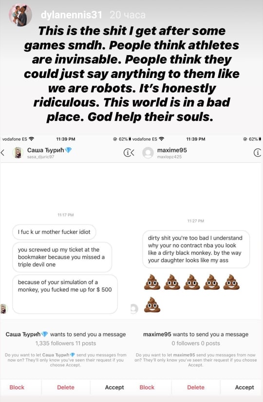 "Ти си толкова лош играч. Разбрах защо нямаш договор в НБА, приличаш на черна мръсна маймуна", е гласяла част от едното съобщение, докато другото е звучало по следния начин. "Загубих залог, защото не можа да вкараш тройка. Ти си маймуна, изгубих 500 долара заради теб"