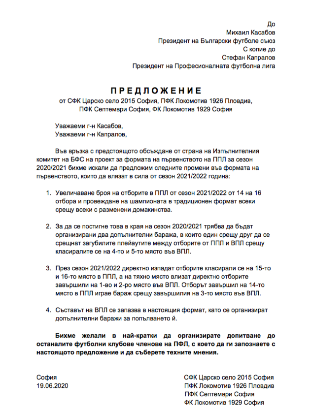 Ръководствата на носителя на Купата на България Локомотив (Пловдив), Царско село, Септември (София) и Локомотив (София) са изпратили официално писмо до президента на БФС Михаил Касабов и президента на ПФЛ Стефан Капралов, в което предлагат догодина първенството на efbet Лига да бъде от 16 отбора, а не от 14, както е през последните години.
