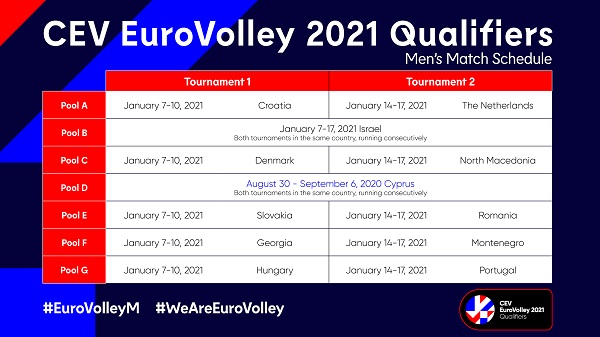 Станаха ясни датите на квалификационните турнири по волейбол за мъже за Евро 2021. България ще мери сили с домакините Израел и Австрия в рамките на два турнира на израелска земя от 7 до 17 януари 2021 година.