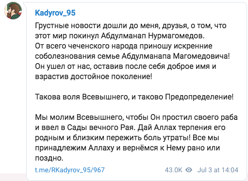 „Абдулманап Нурмагомедов ни напусна. Искам да поднеса искрените си съболезнования и тези на чеченския народ на семейството на Абдулманап. Той остави зад себе си добро име и стойностно поколение."