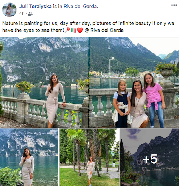 Една от най-добрите български тенисистки Джулия Терзийска се радва на красивата природа на Италия. Петата ракета на България, която в момента е №455 в ранглистата на WTA, публикува във Facebook снимки от красивия град Рива дел Гарда в провинция Трентино.