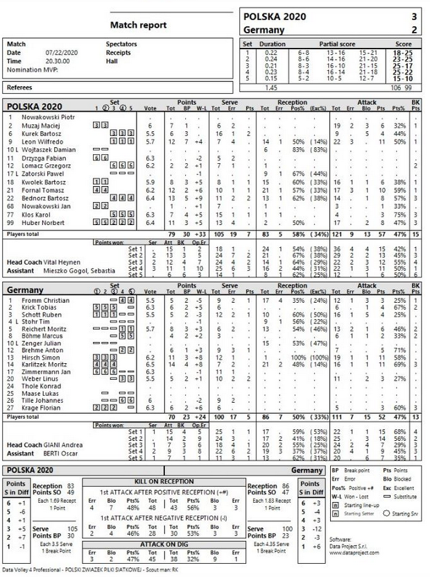 Най-резултатен бе Бартош Беднож с 13 точки (2 аса, 3 блокади), по 12 точки добавиха Вилфредо Леон (1 блокада) и Томаш Форнал (1 ас, 1 блокада). С 11 се разписа Норберт Хубер (3 блокади). За съперника Мориц Карлицек бе над всички с 14 точки (3 блокади), 11 реализира Симон Хирш.