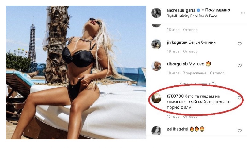 "Като те гледам на снимките - готова си за порно филм", пише почитател на Андреа към снимката, която вече натрупа повече от 7 хиляди харесвания.