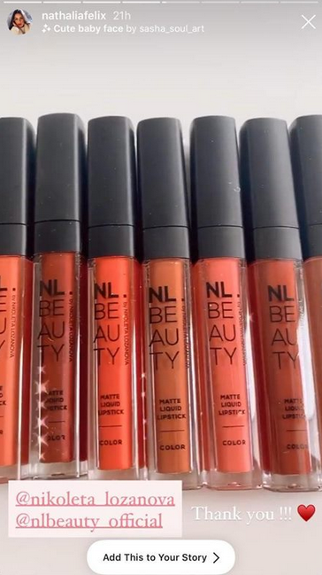 Красивата приятелка на халфа на Ювентус и бразилския национален отбор Дъглас Коста - Наталия Феликс, се оказа почитателка на Николета Лозанова. И по-точно на течните матови червила от нейната марка NL Beauty.