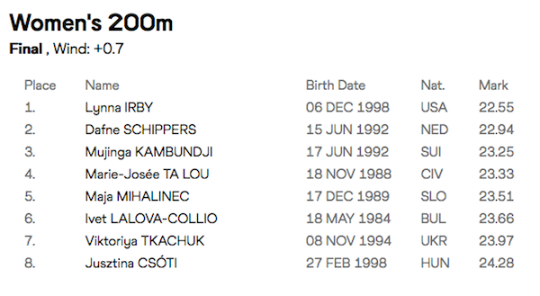 Най-добрата българска спринтьорка Ивет Лалова-Колио завърши на шесто място в спринта на 200 метра при жените на турнира по лека атлетика "Ищван Дюлай" в унгарския град Секешфекервар. Българката финишира за 23.66 секунди. Победителка стана Лина Ърби (САЩ) с 22.55 секунди, пред двукратната световна шампионка в дисциплината Дафне Схипърс (Нидерландия) с 22.94 секунди и Муджинга Камбунджи (Швейцария) с 23.25 секунди.