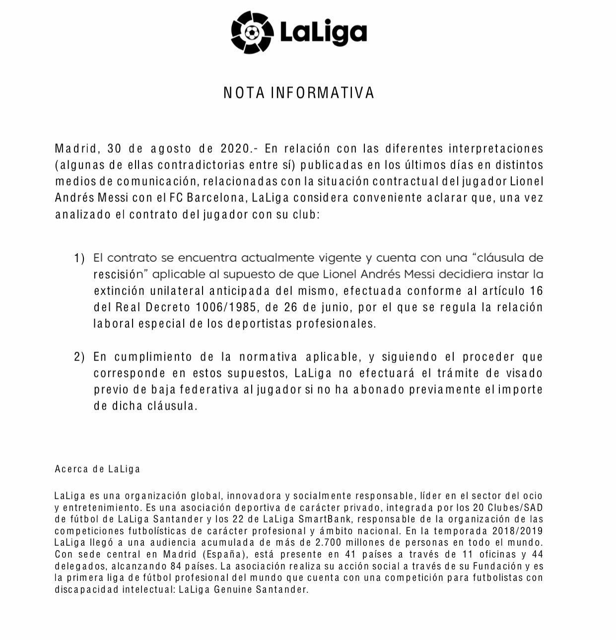 "Във връзка с различните интерпретации, публикувани в последните дни в различни медии, отнасящи се за ситуацията с договора на Лионел Андрес Меси с Барселона, Ла Лига смята, че е необходимо да разясни нещата, след като анализира договора на играча с клуба: