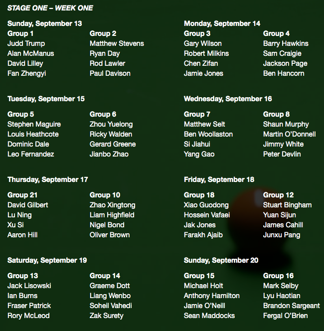 Джъд Тръмп е първи поставен в група 1 и съответно ще изиграе първия двубой от новата кампания в джентълменския спорт, а съперниците му са Алън Макманъс, Дейвид Лили и Фан Дженгуй. В група 2 силите си ще премерят Матю Стивънс, Райън Дей, Род Лоулър и Пол Дейвисън.